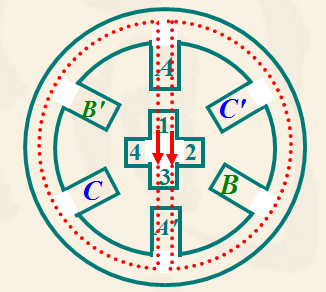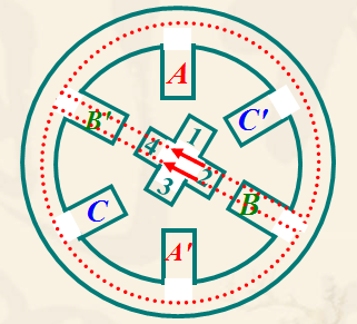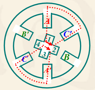 ![]() B相通電,轉(zhuǎn)子2、4齒和B相軸線對(duì)齊,相對(duì)A相通電位置轉(zhuǎn)30°;