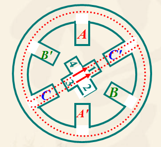 ![]() (1)BB' 磁場(chǎng)對(duì) 2、4 齒有磁拉力,該拉力使轉(zhuǎn)子順時(shí)針?lè)较蜣D(zhuǎn)動(dòng)。 (2)AA' 磁場(chǎng)繼續(xù)對(duì)1、3齒有拉力。 所以轉(zhuǎn)子轉(zhuǎn)到兩磁拉力平衡的位置上。相對(duì)AA' 通電,轉(zhuǎn)子轉(zhuǎn)了15°。 B相通電,轉(zhuǎn)子2、4齒和B相對(duì)齊,又轉(zhuǎn)了15°。