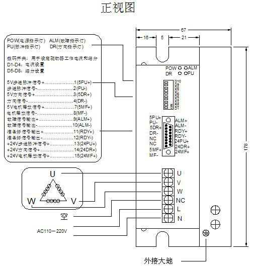 注:可根據(jù)客戶要求定制細分數(shù)! !注意 1、輸入電壓不能超過交流220V; 2、輸入控制信號電平為5V,當高于5V時需要接限流電阻,此款驅(qū)動器自帶24V的信號接口; 3、輸入脈沖信號下降沿有效; 4、驅(qū)動器溫度超過80度時驅(qū)動器停止工作,故障指示燈ALM亮,直到驅(qū)動器溫度降到50度時,驅(qū)動器需要重新上電才能恢復工作。出現(xiàn)過熱保護請加裝散熱器; 5、過流(負載短路)故障指示燈ALM亮,請檢查電機接線及其他短路故障,排除后需要重新上電恢復; 6、無電機故障指示燈ALM亮,請檢查電機接線,排除后需要重新上電恢復。 驅(qū)動器接線、尺寸示意圖